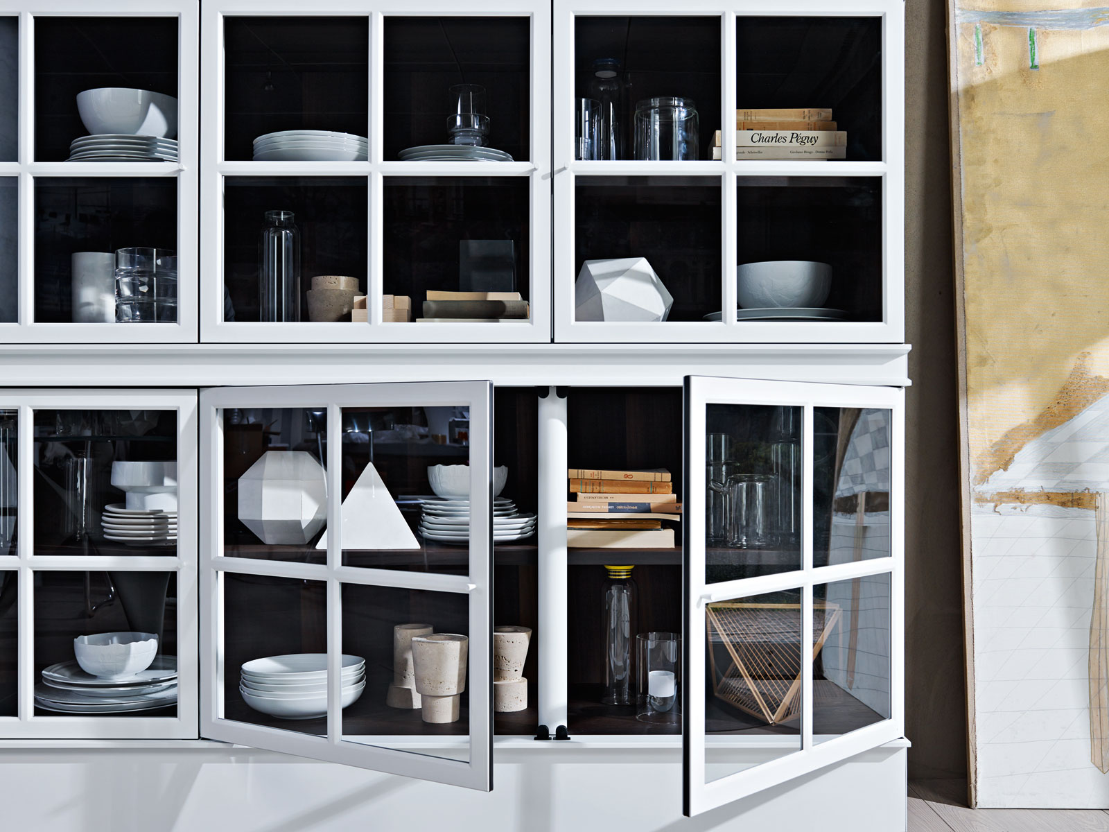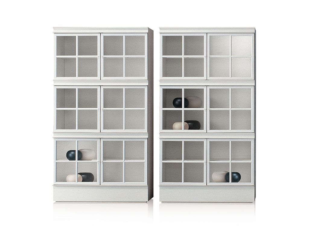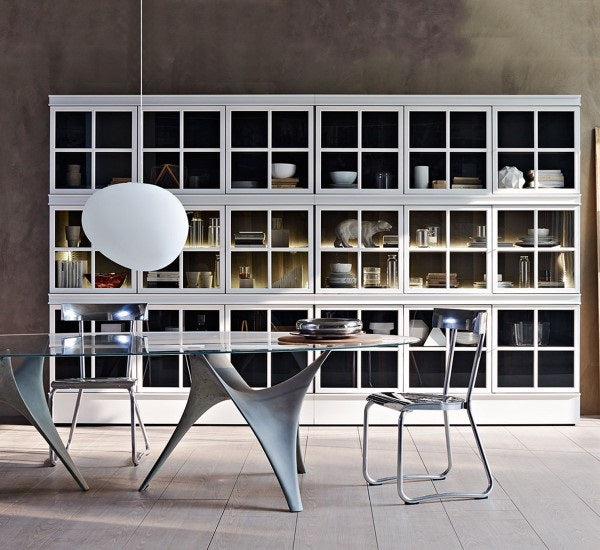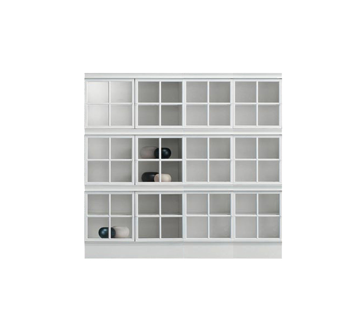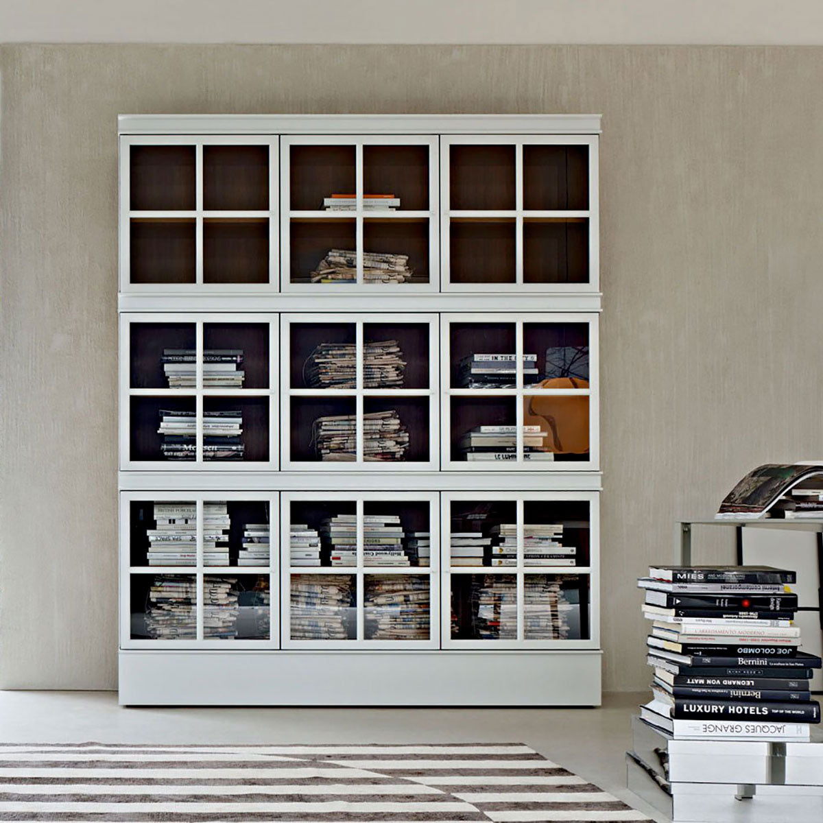 Aldo Rossi and Luca Meda have designed a piece of architecture; a large facade featuring regularly spaced windows and inspired by the Regione Umbria headquarter’s facade in Perugia. A bookcase with glass front and wood or lacquered structure and a metal front matt lacquered. Piroscafo is a versatile home cupboard - a bookcase for the study, a display cabinet for the living room or a sideboard for the kitchen. A range of open bookshelves with glass doors and square metal frame, divided into four by an inner wood or lacquered cross structure and a lacquered matt metal façade. It is possible to illuminate the inside with one or more LED lights on lids, and floors, or for the entire length of the central tops and shelves.