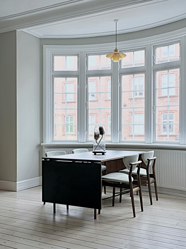The 108 Chair was originally designed by Finn Juhl in 1946. On the surface, it looks like any ordinary dining chair. Upon closer inspection, surprising details such as angled side bars and sliding cross bars are revealed. These details add unexpected movement and dynamics to the construction. The chair is manufactured in oak, walnut or black painted and with upholstery in textile or leather.