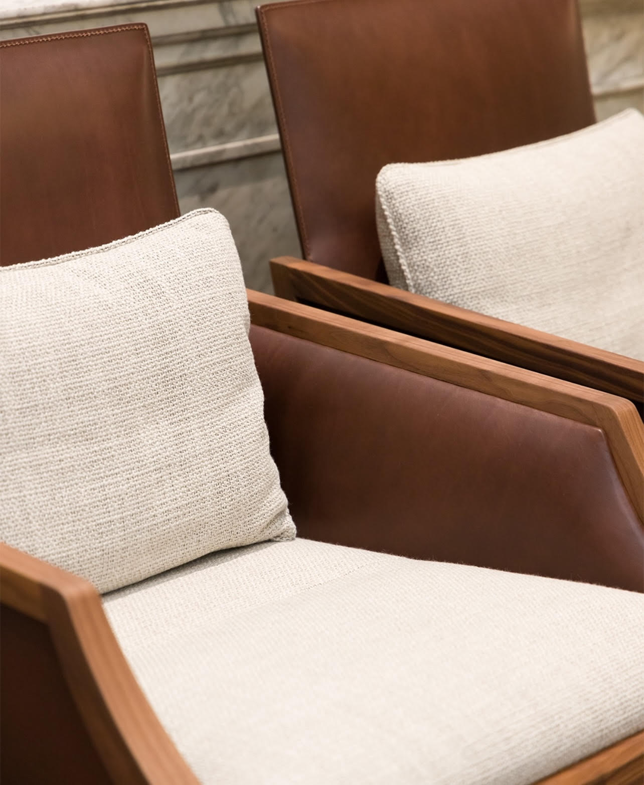 Lounge chair with an important shape and size conceived for residential interiors or lounge areas and made of a thick leather shell and structure in tapered wood. Ergonomic and enveloping, it offers maximum seating comfort.