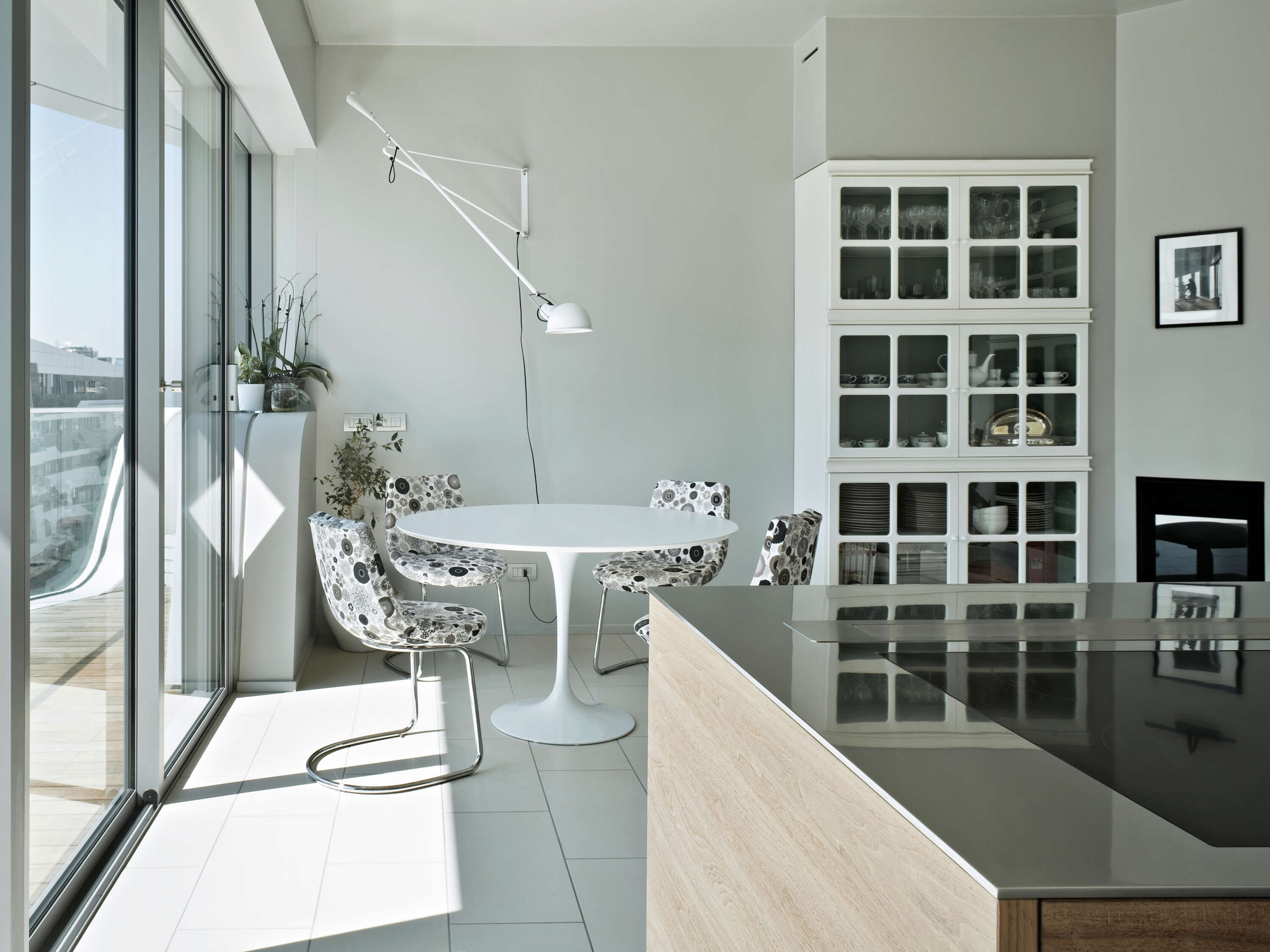 Wall lamp providing direct light. Painted steel adjustable arm and reflector. Chrome-plated brass reflector support. Cast iron tapered counterweight. Painted steel wall fixture.