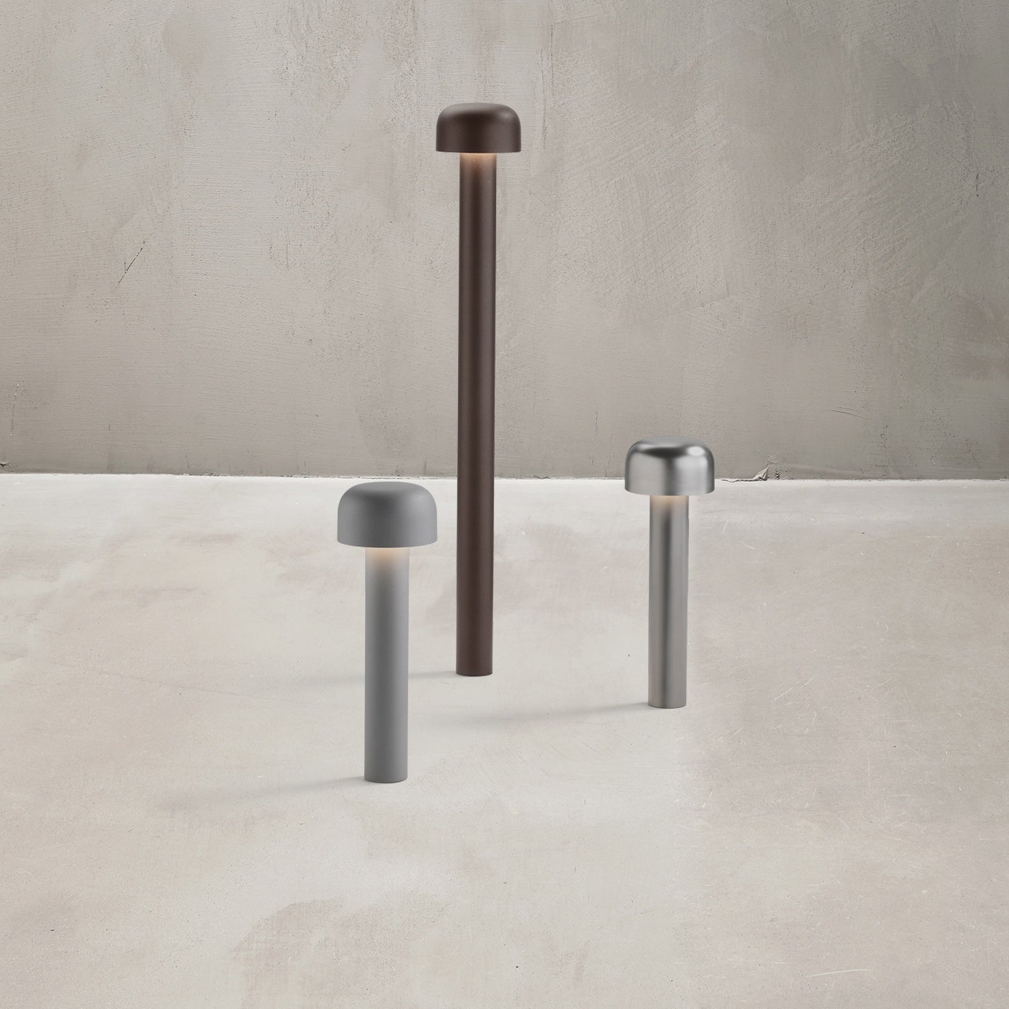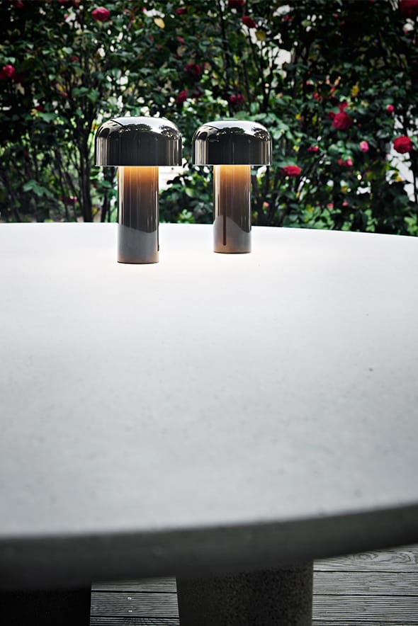 Rechargeable direct light table lighting device. Base and dome in coloured PC. Diffuser in Opaline injection moulded photo-engraved PC. 24-hours' autonomy, charging via Micro-USB-C. Push-button switch positioned on the base provides the 4-step dimmer function. Battery status indicator positioned under the base. USB-C charging cable included, useful length 120cm. USB battery charging on plug with interchangeable plugs.