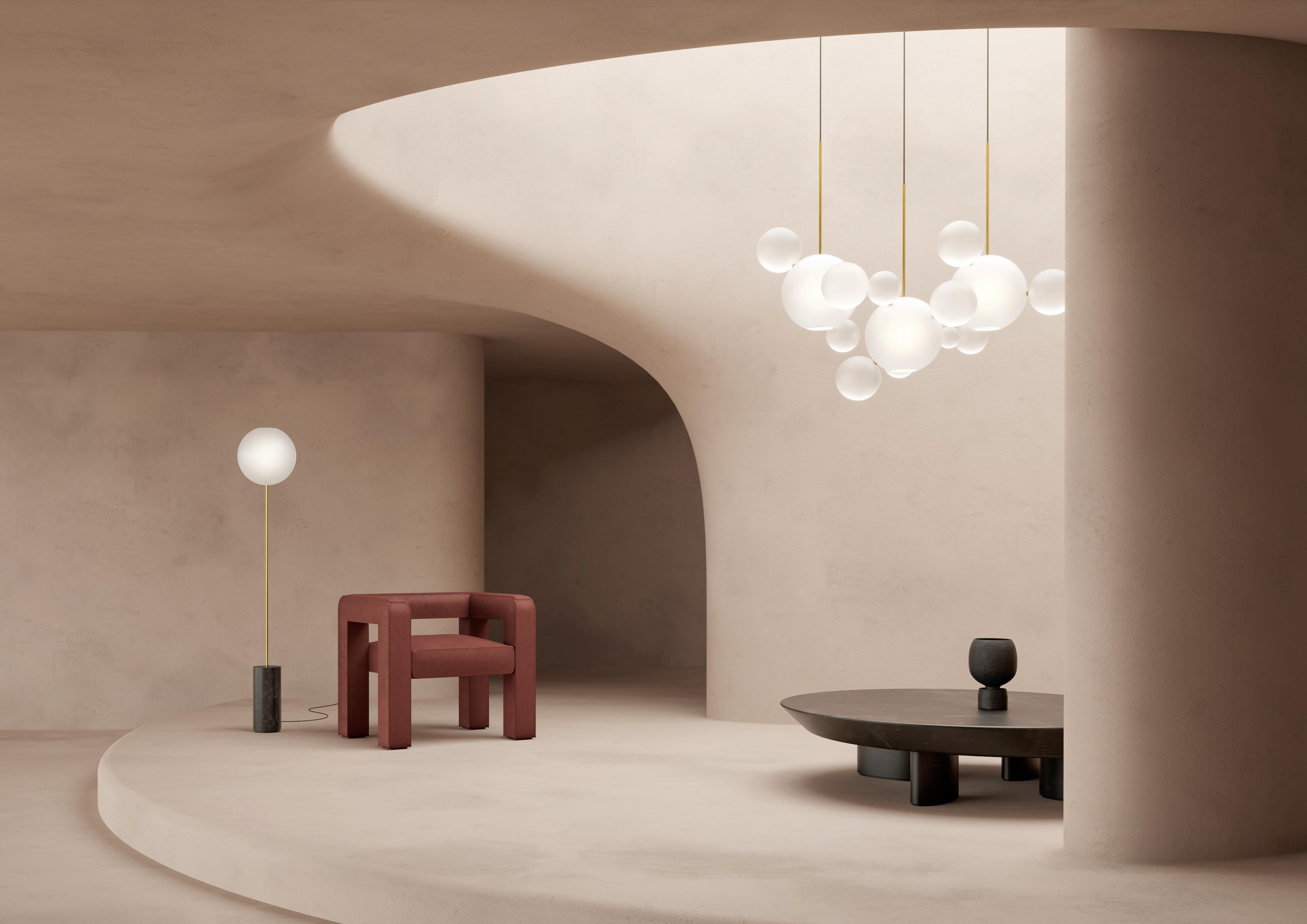 Elevate your space with the exquisite Bolle Frosted Suspensions by Giopato & Coombes. This stunning lighting fixture is an artistic exploration of light and texture, inspired by the soft, ethereal appearance of clouds. The frosted spheres crafted from hand-blown borosilicate glass feature a delicate frosting treatment, adding a tactile and visual softness. The elegant brass structure is available in various finishes, allowing customization to suit any refined interior.