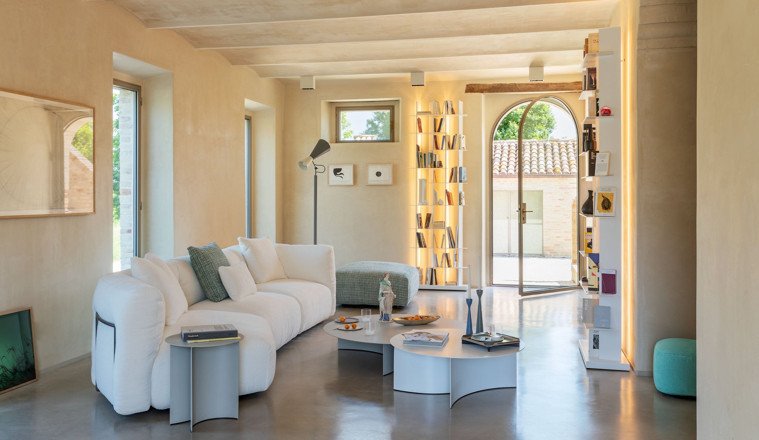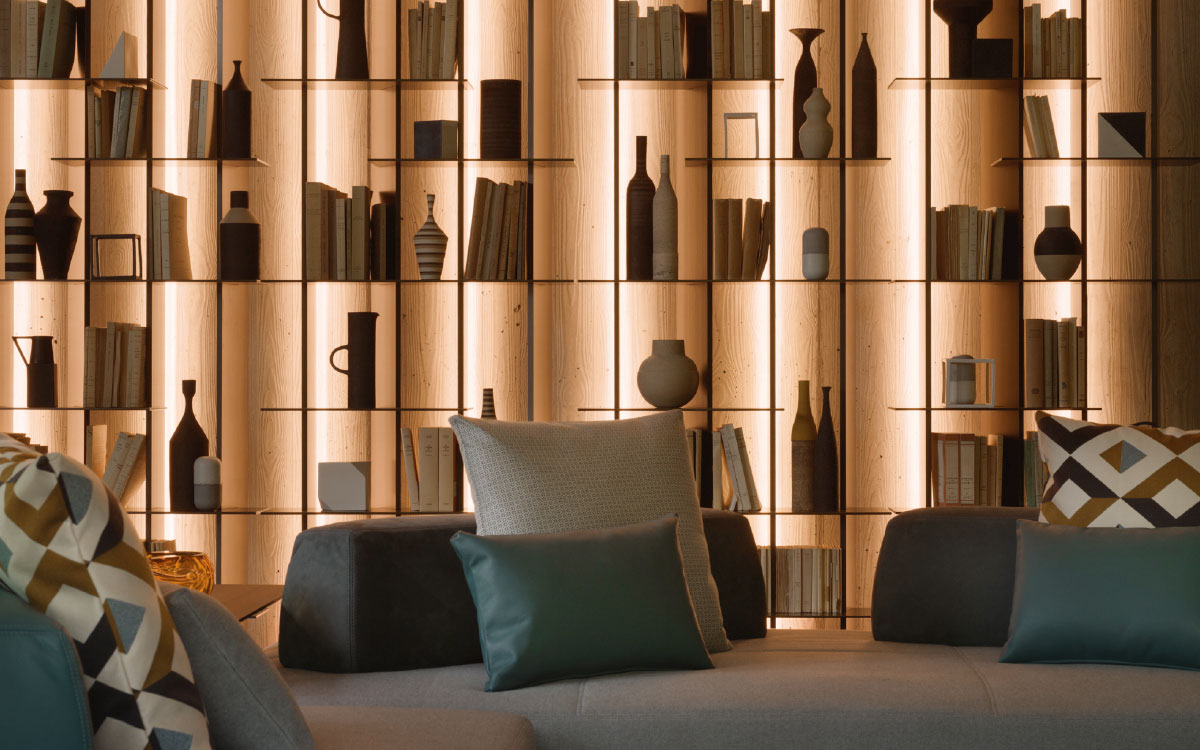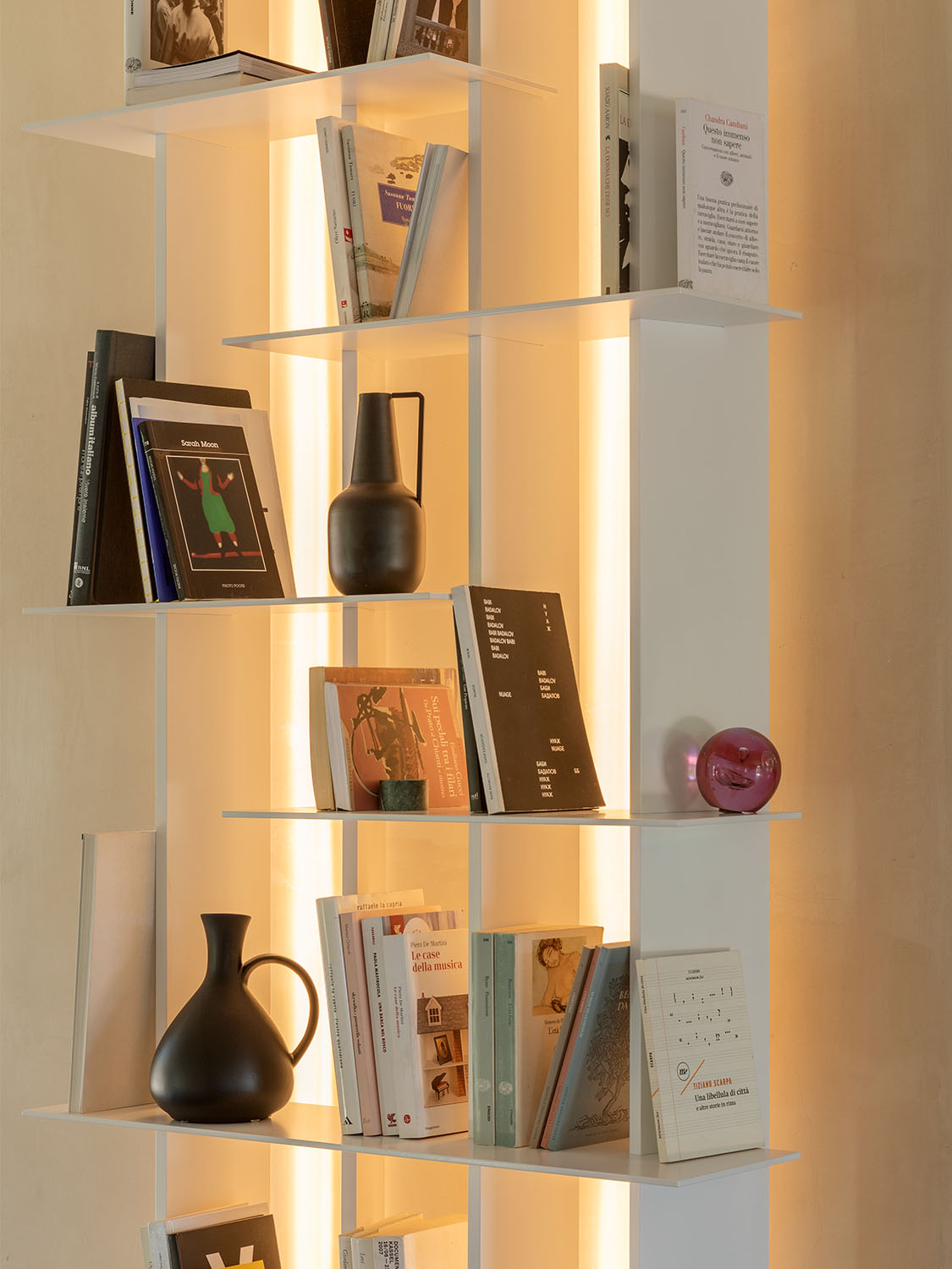 The bookcase CCLight is the perfect example of how light can inject a sense of airiness, a special atmosphere and a touch of magic into the ambiance. The LEDs are inserted into the first and the third uprights. When switched on, they create suggestive shapes and emit a quantity of light equivalent to a standard lamp. The slim, elegant aluminium structure is joined by maximum function. The bookcase is available in different heights and in the following colours: white, black, matt burnished, anodic bronze, matt greige, oxide, silver oxide and desert rock.