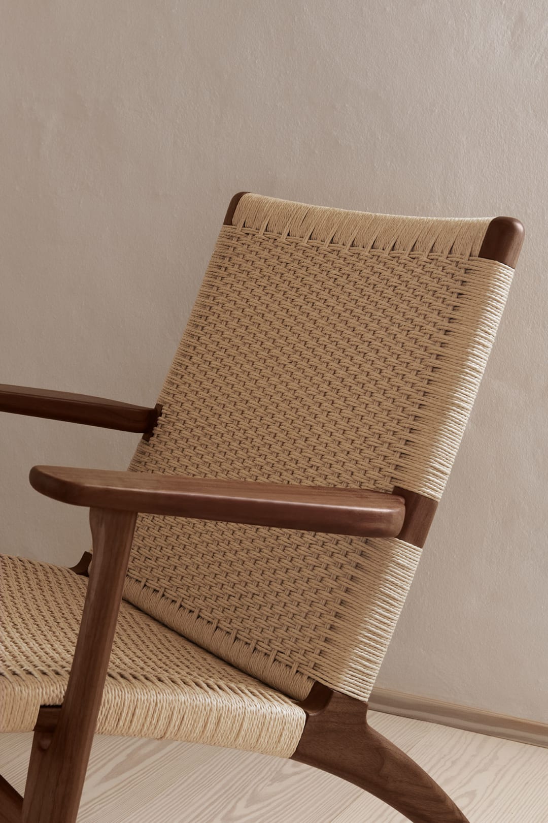 The CH25 lounge chair, like many of Hans J. Wegner’s other iconic designs, is clean and simple in its distinctive shape. But its introduction caused a stir due to Wegner’s choice of materials on the backrest and seat. The woven paper cord, a replacement for seagrass developed during World War II, had not been used in furniture before. However, Wegner was enthusiastic about the look of the material and its non-stretching and optimal durability, and so were generations after him. The CH25 lounge chair has remained tremendously popular and has been in continuous production since 1950: a testament to Wegner’s visionary approach. It takes a skilled craftsman 10 hours and approximately 400 meters of paper cord to complete one seat and backrest by hand, using a particular technique resembling weaving, which is visible on both sides of the backrest. The striking result of this exacting process is an exceptional chair that is fascinating from all angles.