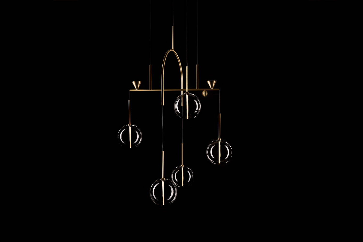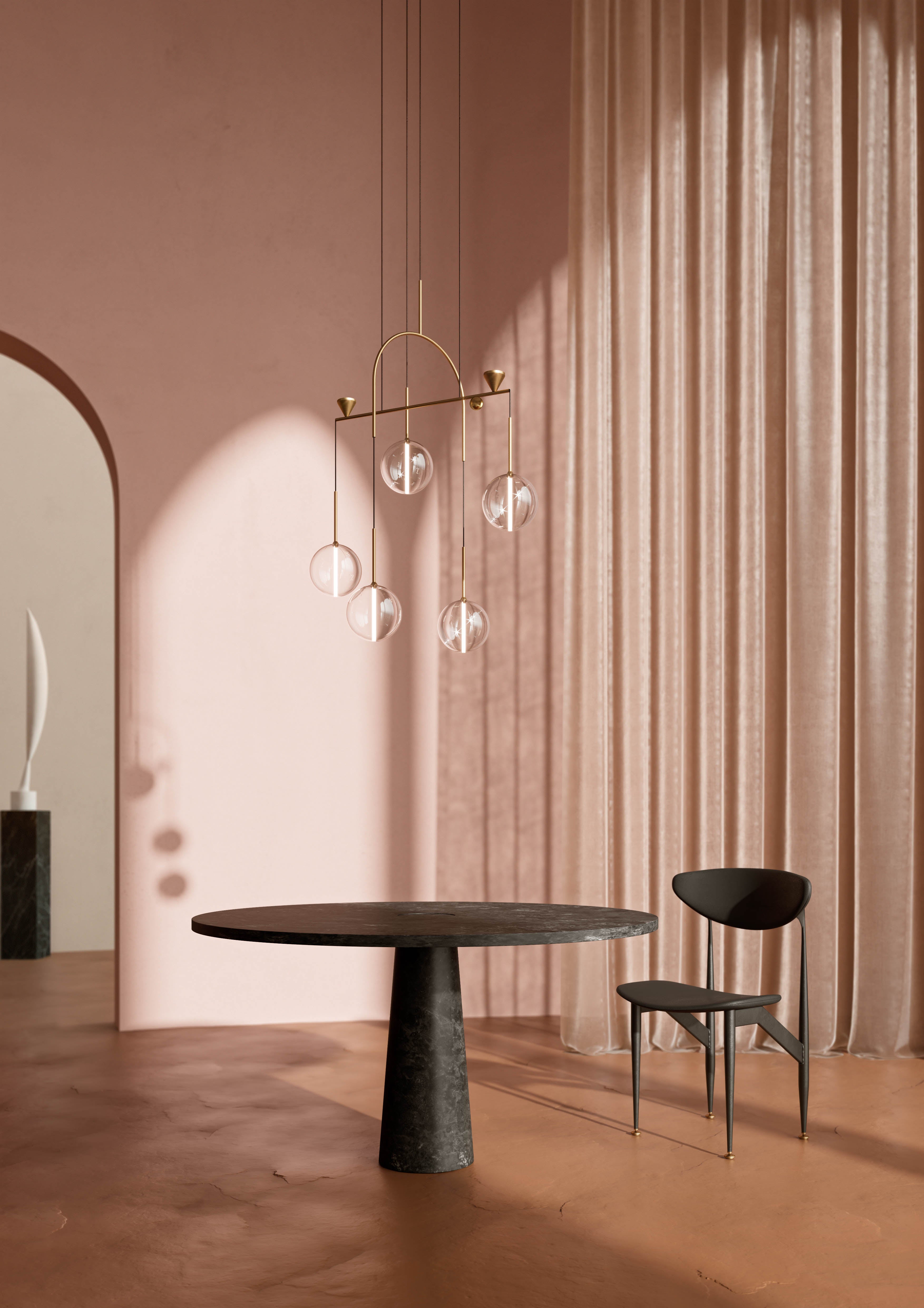 Hand-blown frosted borosilicate glass and hand-finished or electroplated brass.