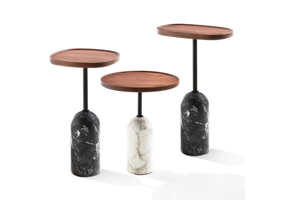 Side table with cylindrical marble base available in white Carrara or Carnic grey, central pole in black matt metal and top in solid canaletta walnut with lowered surface work.