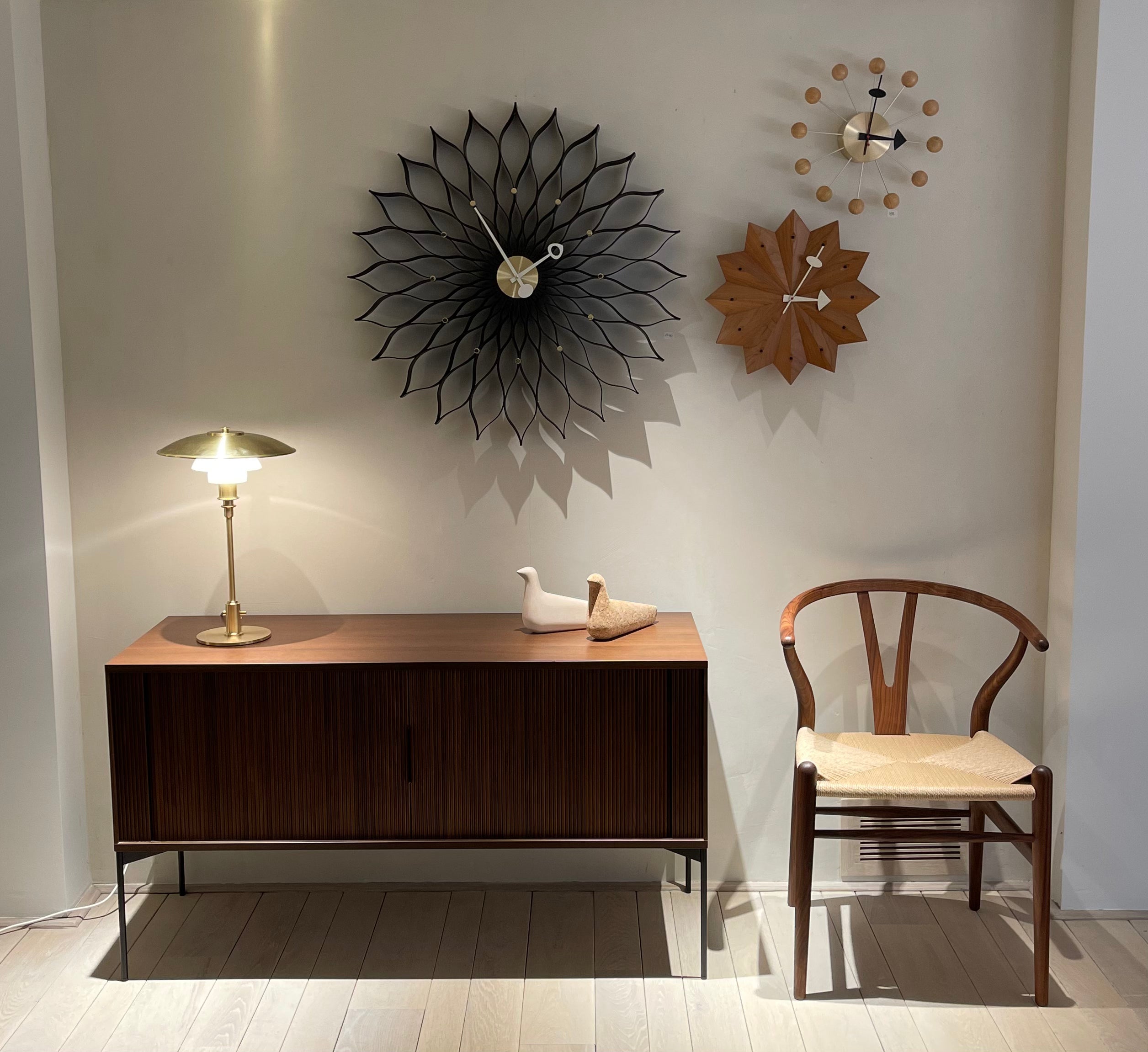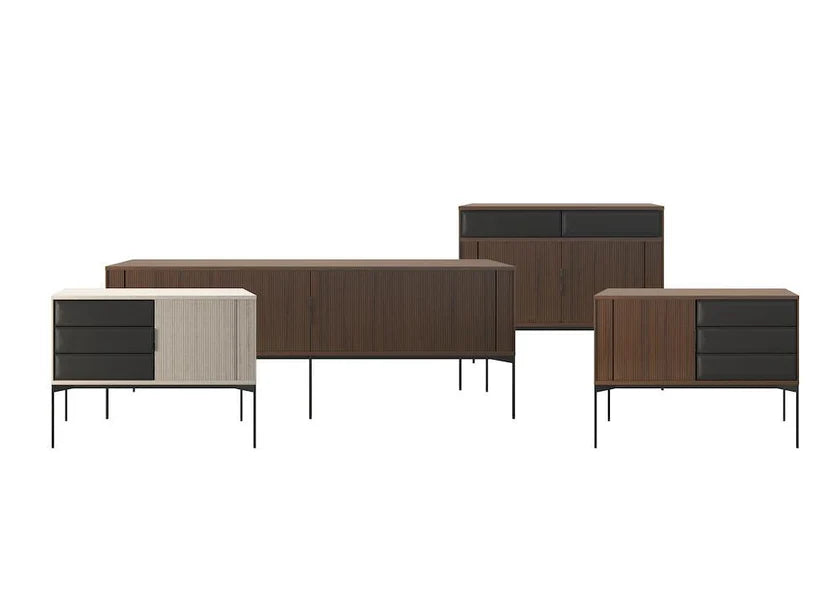 Jabara sideboard is characterized by its 'Jabara' door, a sliding tambour door whose classical design is refined to timeless and minimalist beauty. It looks modern but somehow exudes nostalgic warmth. The unique appearance of the door conjures up an image of beautiful and continuous fine lines particular to Japan, which are seen in reed screen doors of townhouses in summer, and a bamboo forest in Sagano, Kyoto. Strips cut out of selected natural wood, piece by piece, and their rounded surface create fantastic shades, which in turn accentuates its profound look. And its organic and dignified appearance brings excitement and comfort into a room. Thick leather is selected for the front panel of drawers because its smooth but firm texture makes it an ideal material that brings you comfort when your fingers touch it.