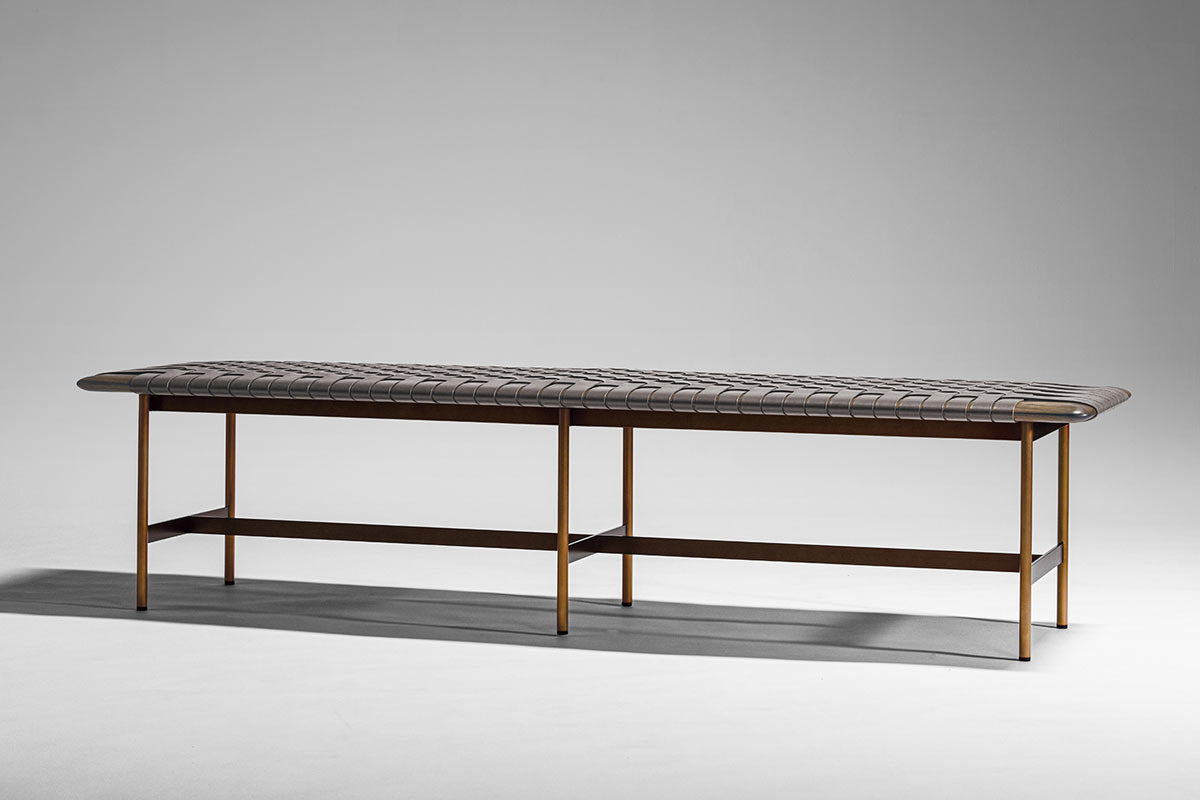 The MT BENCH offers an intricate game of weaves and a combination of quality materials that represent the encounter between tradition and modernity. The interwoven leather straps on the seat convey a pleasant sensation of warmth and perfectly match the structure in steel and solid walnut or oak. The attention to detail, such as the pure lines and rounded edges of the surface, makes this structure a harmonising element in any environment. The bench is available in different colour combinations and in two sizes.