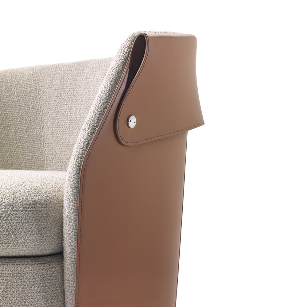 Distinctive feature of the Ozzy armchair, as with the eponymous ottoman and dining chair, is the cowhide-clad outer backrest that can be paired, in an array of elegant combinations, with the seat upholstery, available in leather and fabric. Supported on a metal swivel base, the armchair welcomes soft goose-down cushions that lend elegance and exceptional comfort to the seat.