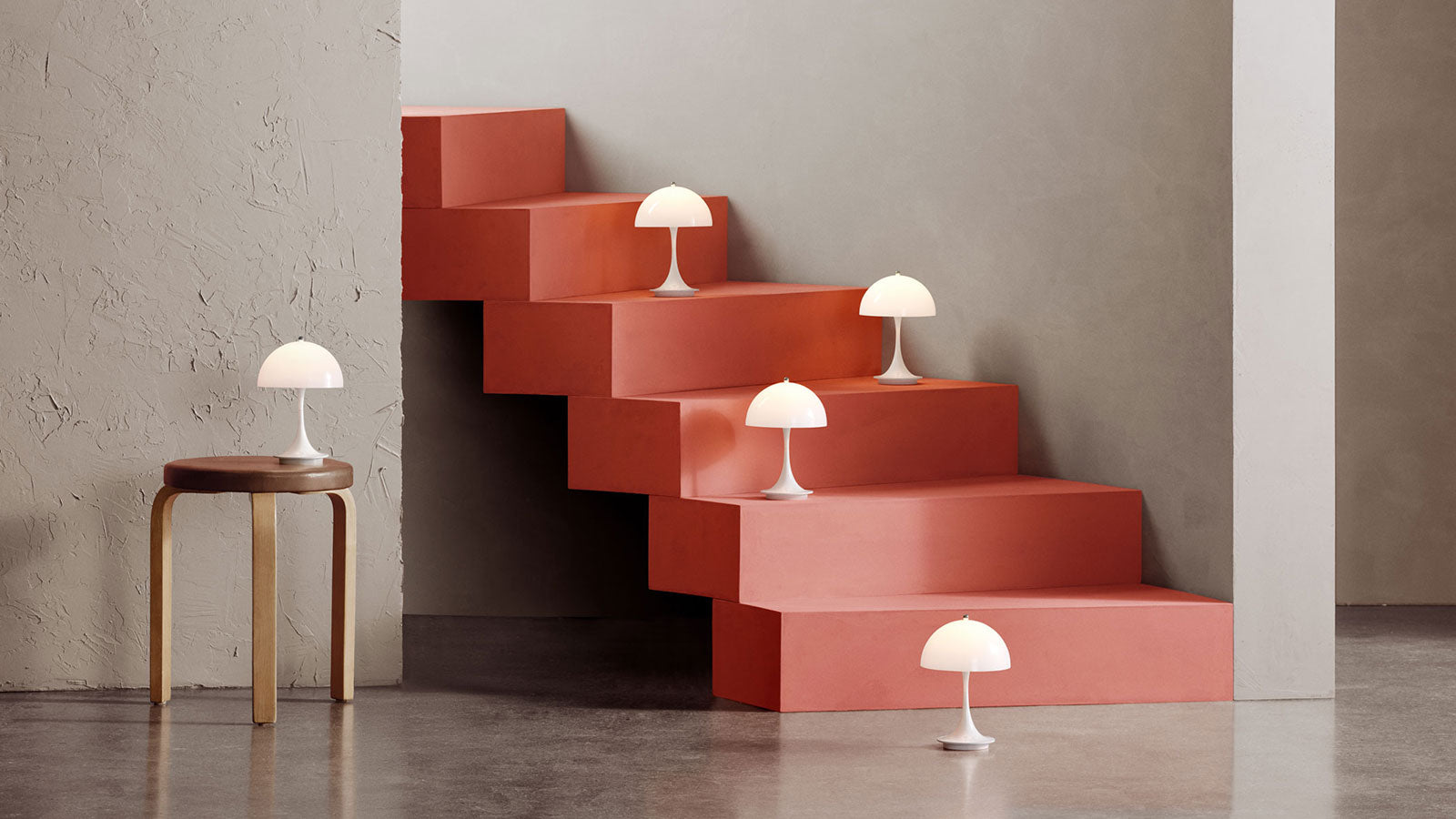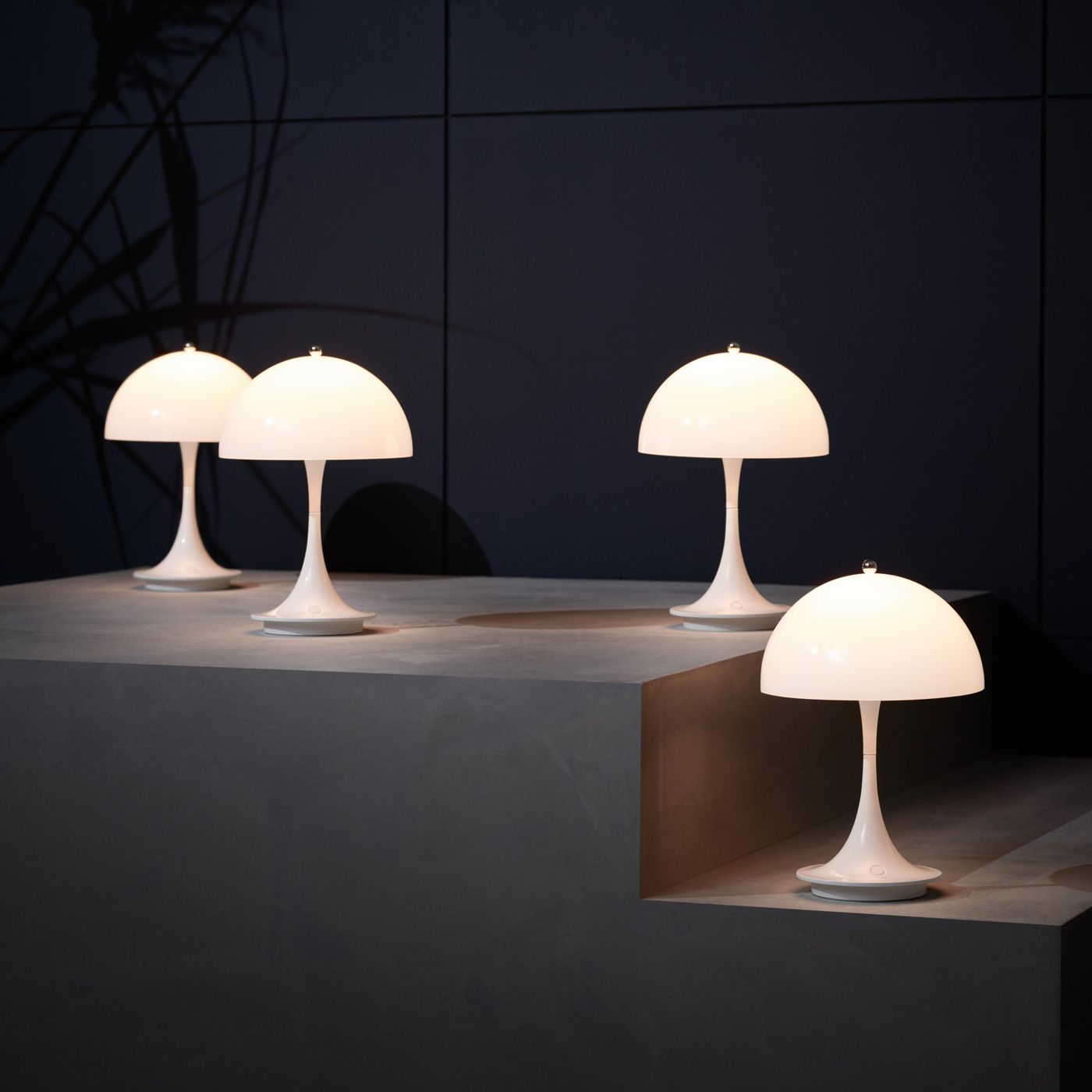 Battery lifetime: 5 hours @ 100%. Step dim, short press: 0%/10%/33%/100%. Function to set a fixed light level. Please note that Panthella Portable comes with a USB cable but without adapter and QI charger. Separate USB adapter is available as accessory. Compatible with standard USB adapters (Min. 1.5A) and QI wireless chargers. IP44 classified. The lamp is fitted with an integrated energy-saving LED light source.