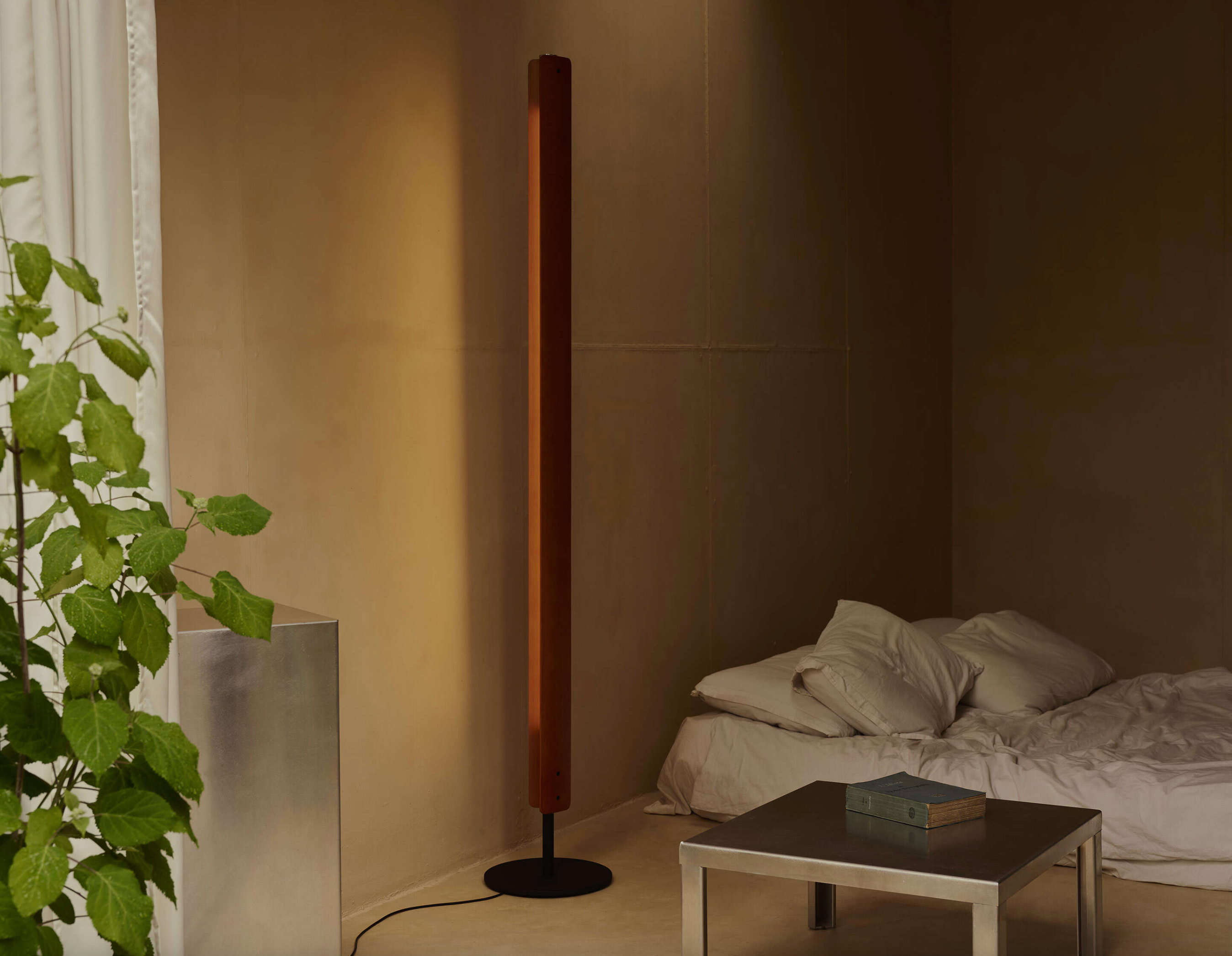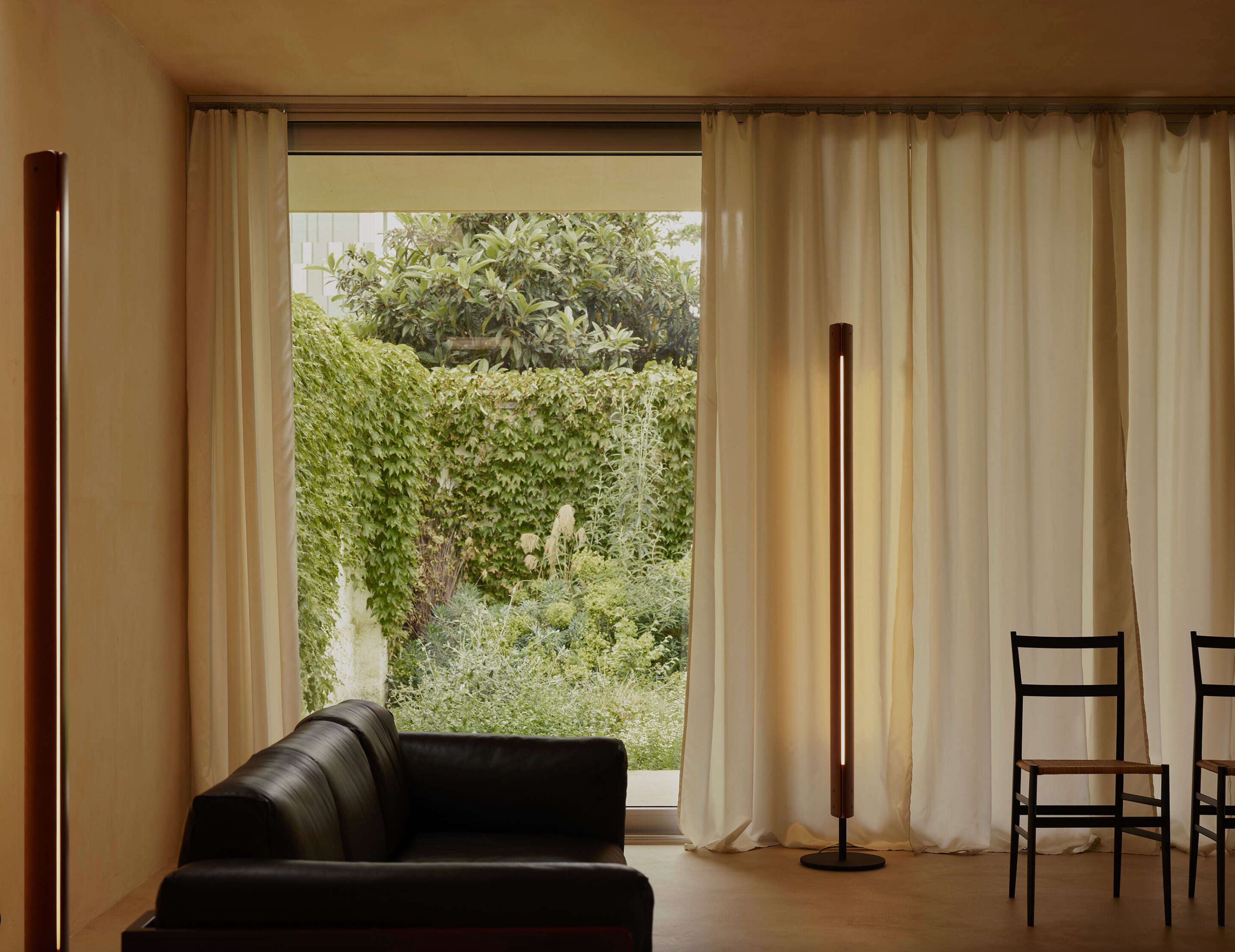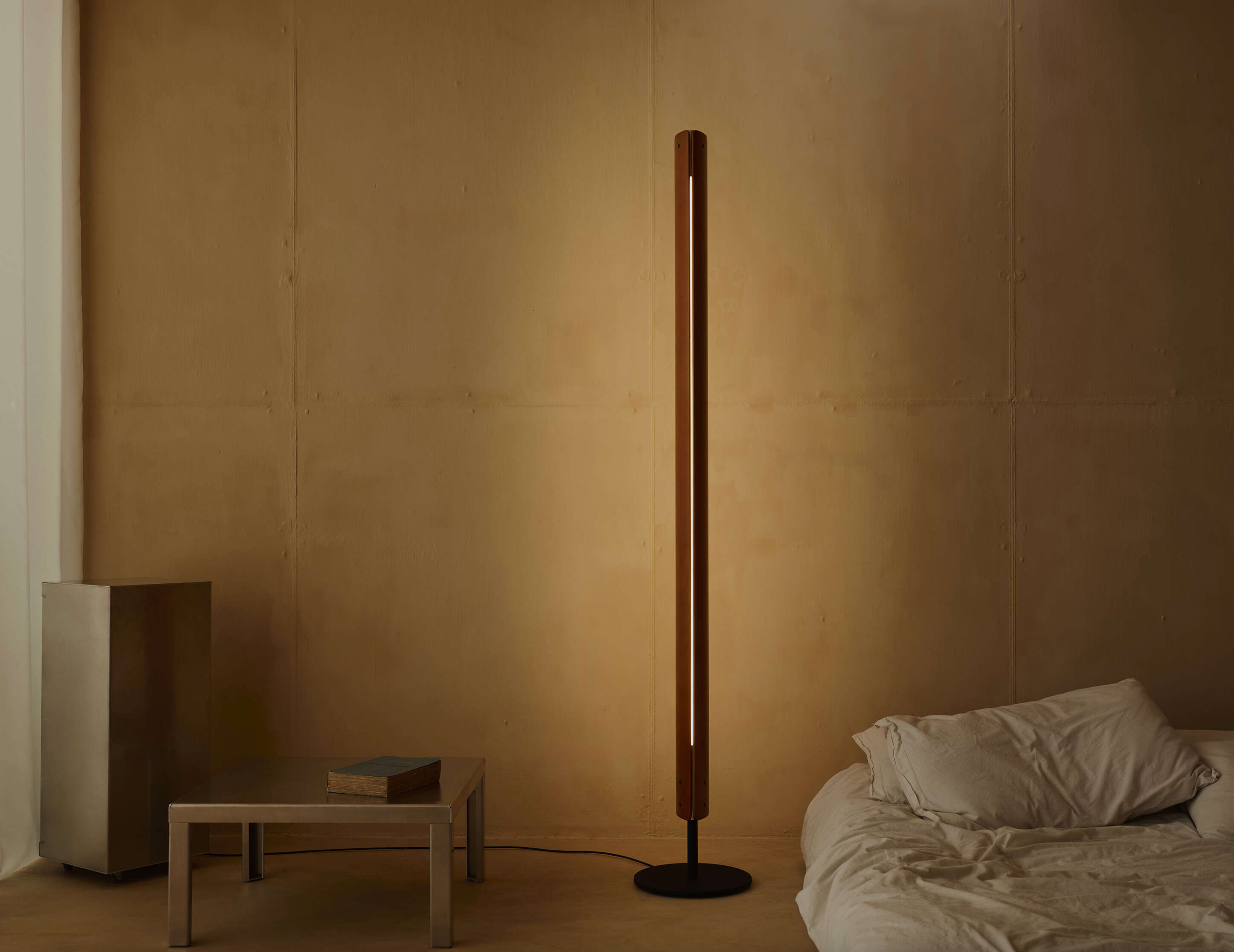 Floor lamp emitting direct and indirect light with symmetrical and asymmetrical distribution. Features two vertical ash wood blades joined by chromed metal fittings. Blades rotate around a central tubular light source to allow variable light emission. Raw black iron base separated from the vertical blades by a collar. Custom-developed dimmable linear LED light source. The lamp can also be fitted with standard T8 LED tubes.Designed by Tobia Scarpa in 1963 and reissued in 2025, Seki-Han is testament to his mastery of design and wood-working expertise. The intricate construction draws on naval techniques to shape two wooden blades that now rotate around the light source. Even when almost completely closed, a sliver of light remains visible, creating a highly poetic effect. Named after a traditional Japanese rice dish served on special occasions, Seki-Han is a living presence where the immateriality of light meets the tactility of wood.