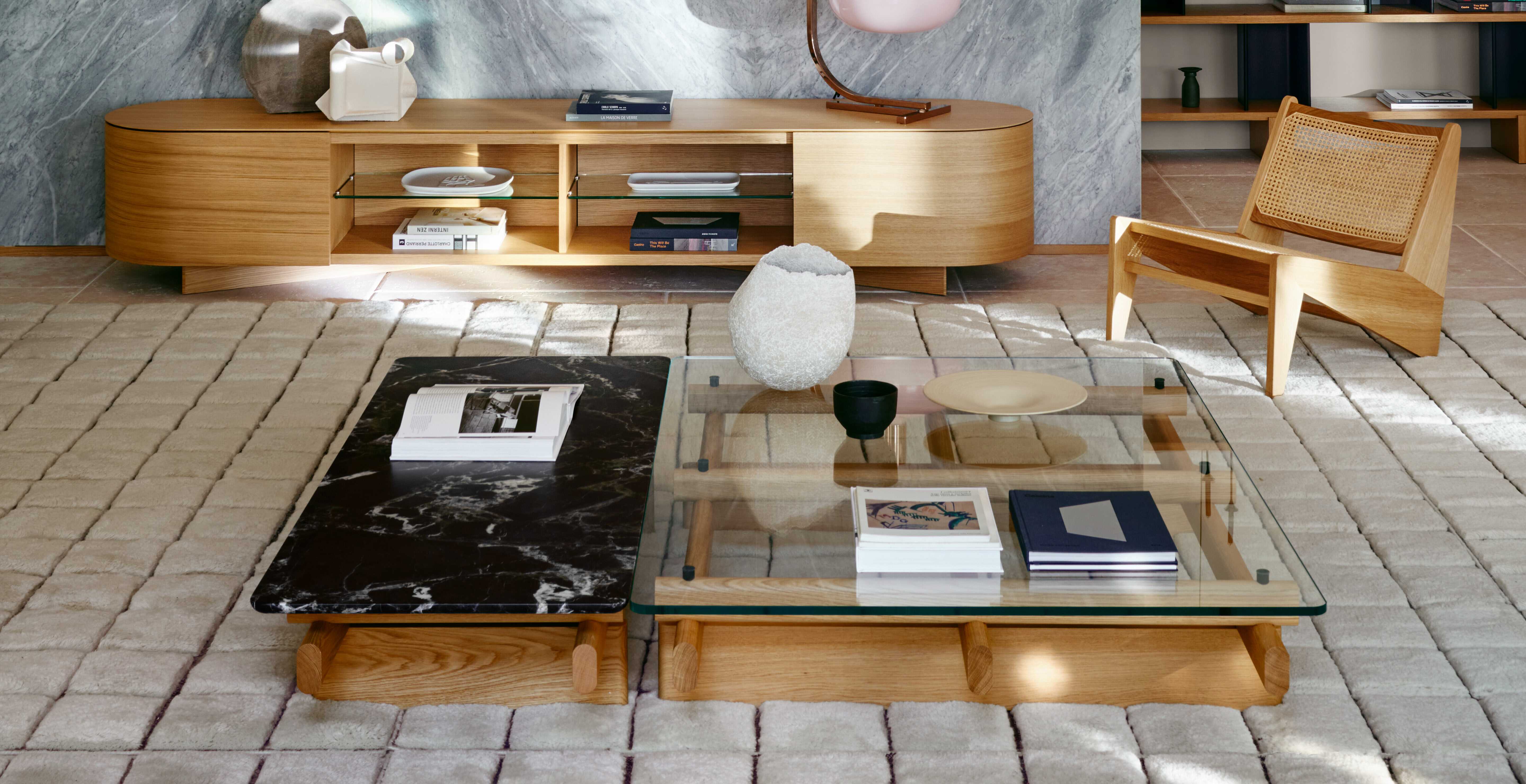 Inspired by Asian influences − a theme that often recurs in the Cassina collections − and especially by the ritual reconstruction of Japanese shrines through the use of different materials, like the other pieces in the Sengu family, the Sengu Coffee Table, designed by Patricia Urquiola, is envisioned as an exquisitely layered and sophisticated home architecture. The base, crafted with a grid of primary and secondary oval solid wood beams, echoes the shapes found in the Sengu Sofa base in both the table with rectangular top in two sizes, and the new round version, available in two diameters to meet different space requirements. For the entire family of low tables, the tops come in extra-clear glass or anthracite colour smoked glass, or in six different types of marble: Carrara, Grigio Carnico, Calacatta Gold, Verde Alpi, Nero Marquina and Rosso Levanto.